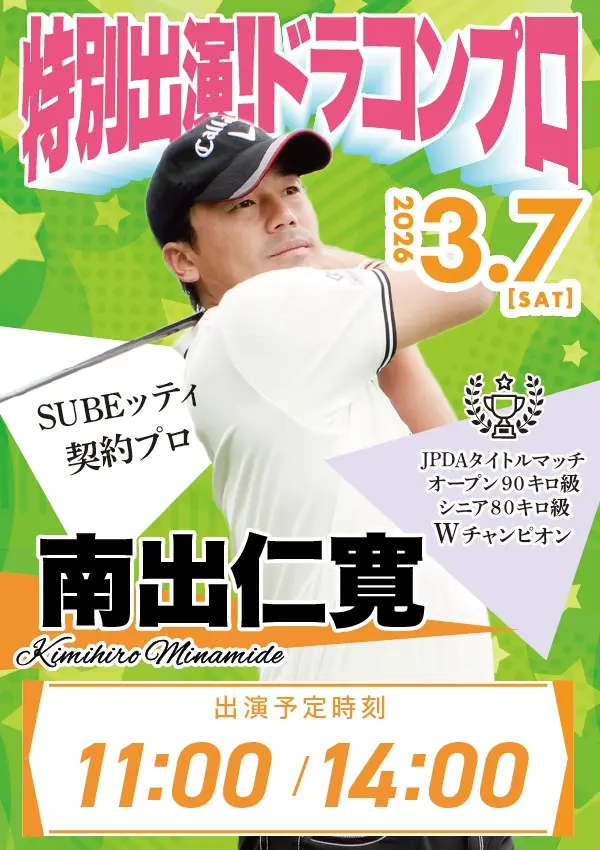 SUBEッティ契約プロである南出仁寛プロと鈴木真緒プロが会場に登場し、トークショーおよび対決イベントを実施します。